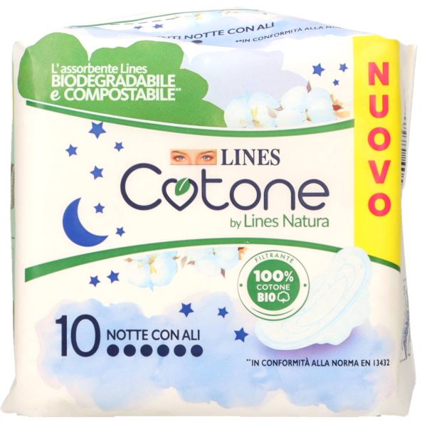 Lines Assorbenti Cotone con Ali dalla grande capacità filtrante e assorbente, garantisce un asciutto a lunga durata, ideale per la notte. È al 100% in cotone. Dermatologicamente testato.